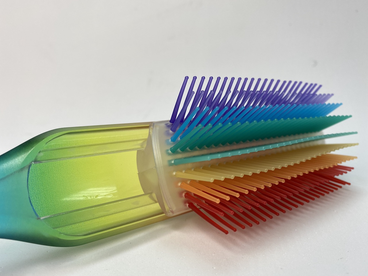 Расческа для укладки оснащена щетинками, которые не вызывают статическое электричество, не царапают кожу головы и деликатно распутывают локоны не травмируя структуру прядей. Кончики щетинок бережно массируют кожу головы прекрасно справляются с расчесыванием и распутыванием длинных, наращенных, мокрых или вьющихся волос, не травмируя их.